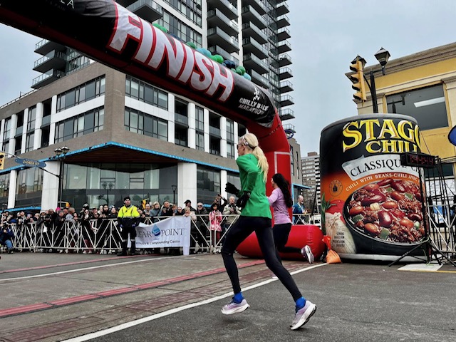 The best part of racing the Chilly Half, literally and figuratively, was catching up with my friend, Lynn. We are in the same age group and are quite compatible pace-wise. For the last 11-13 kilometres of the race, either I was pulling Lynn or she was towing me. Another friend’s (Esther’s) words kept playing over and over: Don’t Back Down. But, when an asthmatic bubble started to form in my chest around 16K, I sensed trouble. I stopped at a water station to try to clear it but had little luck. “Don’t back down.” I was determined to keep Lynn in my sight and ran after her. The last few kilometres were rough but the constant bob of her ponytail gave me something to chase; I picked up my pace for the last 2 kilometres and finished in 1:43:31, less than a minute behind Lynn, who was second in our age group; I was happy with my third place finish as I hadn’t done that at this race in a few years.