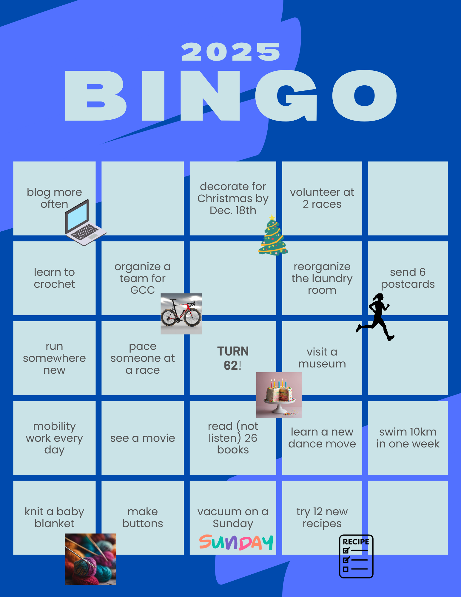 Yesterday, I was inspired by one of my triathlete friends (Marlene) to create a 2025 Bingo card. The task was simple: fill the 25 squares with realistic, wild or silly goals for the year.